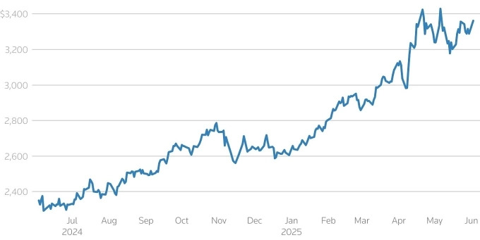 Chốt phiên giao dịch 2/6, giá vàng thế giới giao ngay tăng 92 USD lên 3.380 USD một ounce. Sang phiên sáng 3/6, giá tiếp tục lên 3.386 USD – cao nhất kể từ đầu tháng 5.